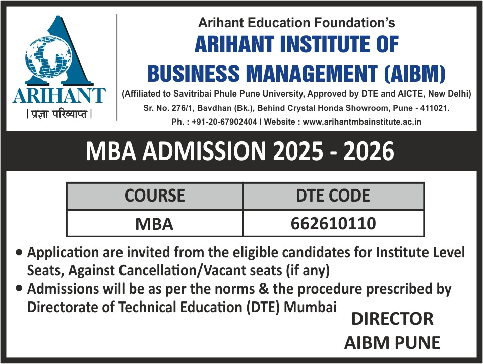 Fees must be paid by DD/ Cheque/ NEFT/RTGS in favour “ARIHANT INSTITUTE OF BUSINESS MANAGEMENT” payable at Pune.